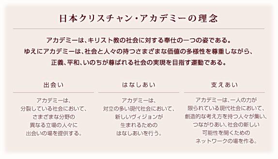 日本におけるアカデミー運動は、ヨーロッパに学んで1960年に始まりました。現在、アカデミー運動は、関東活動センターと関西セミナーハウス及び関西セミナーハウス活動センターを拠点に行なわれています。日本クリスチャン・アカデミーは、同様の目的を持った団体の国際ネットワーク OIKOSNETに加盟しています。